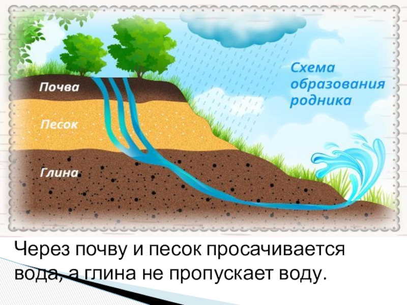 Слайд 3Через почву и песок просачивается вода, а глина не пропускает воду.