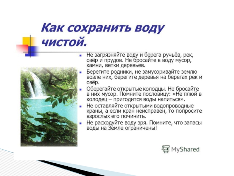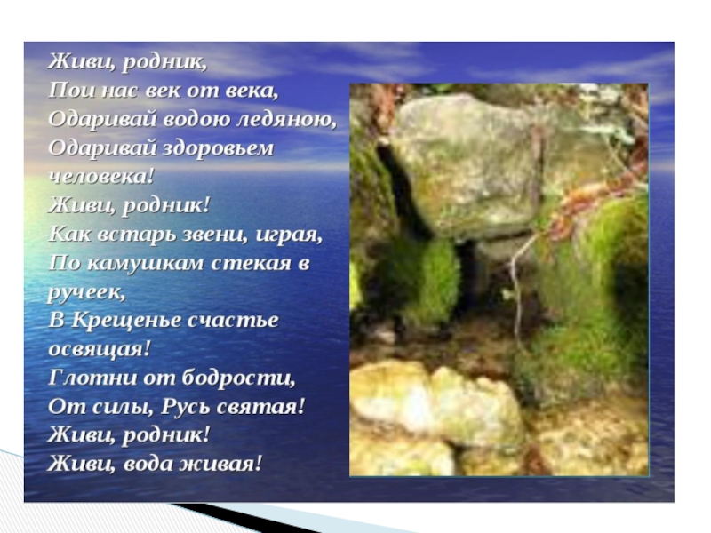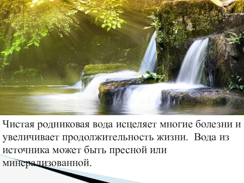 Слайд 10Чистая родниковая вода исцеляет многие болезни и увеличивает продолжительность жизни.  Вода