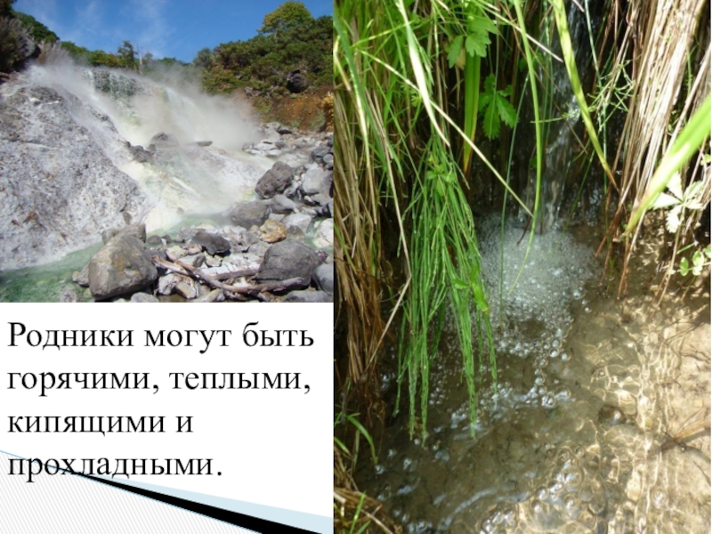Слайд 12Родники могут быть горячими, теплыми, кипящими и прохладными.