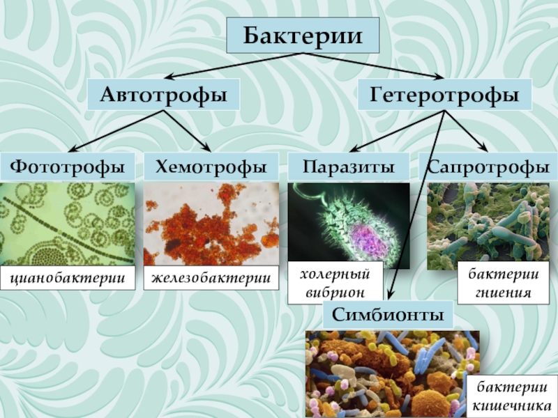 БактерииАвтотрофыГетеротрофыФототрофыХемотрофыПаразитыСапротрофыцианобактериижелезобактериихолерный вибрионСимбионтыбактерии гниениябактерии кишечника