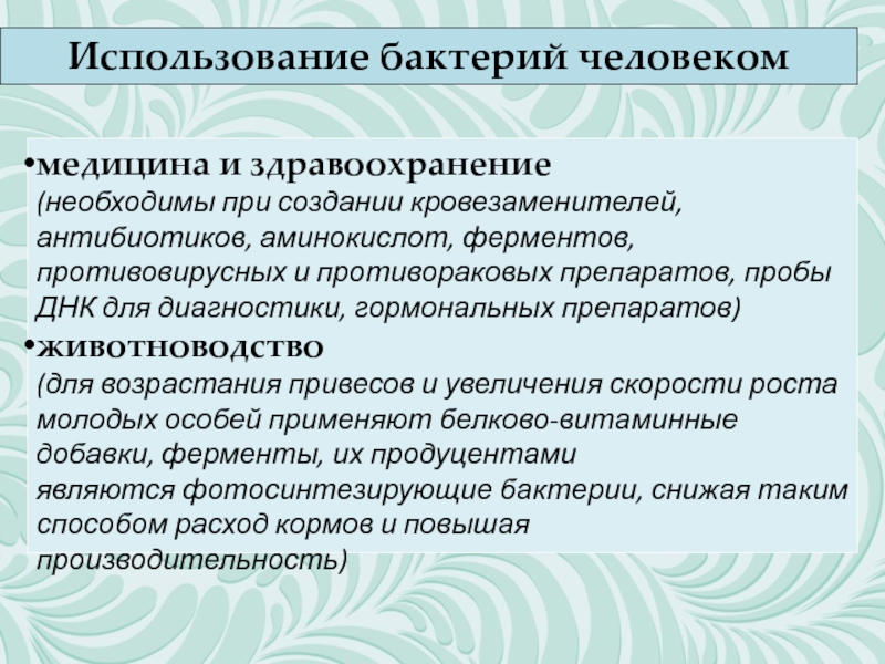 Использование бактерий человекоммедицина и здравоохранение(необходимы при создании кровезаменителей, антибиотиков, аминокислот, ферментов, противовирусных и противораковых препаратов, пробы ДНК