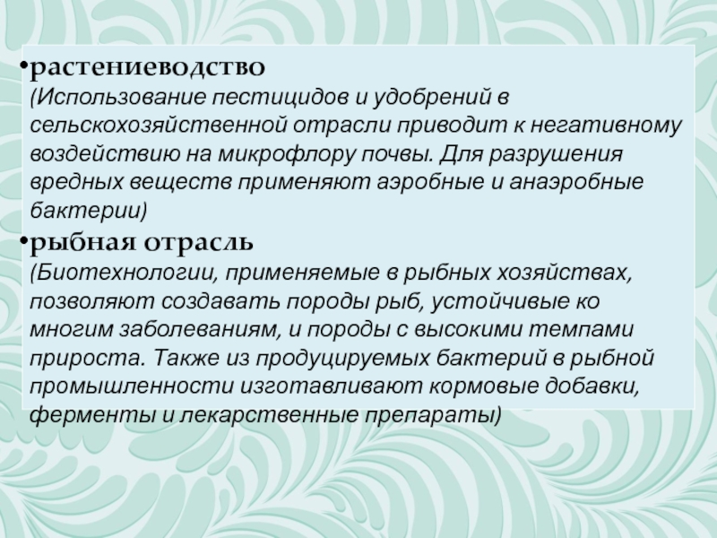 растениеводство(Использование пестицидов и удобрений в сельскохозяйственной отрасли приводит к негативному воздействию на микрофлору почвы. Для разрушения вредных