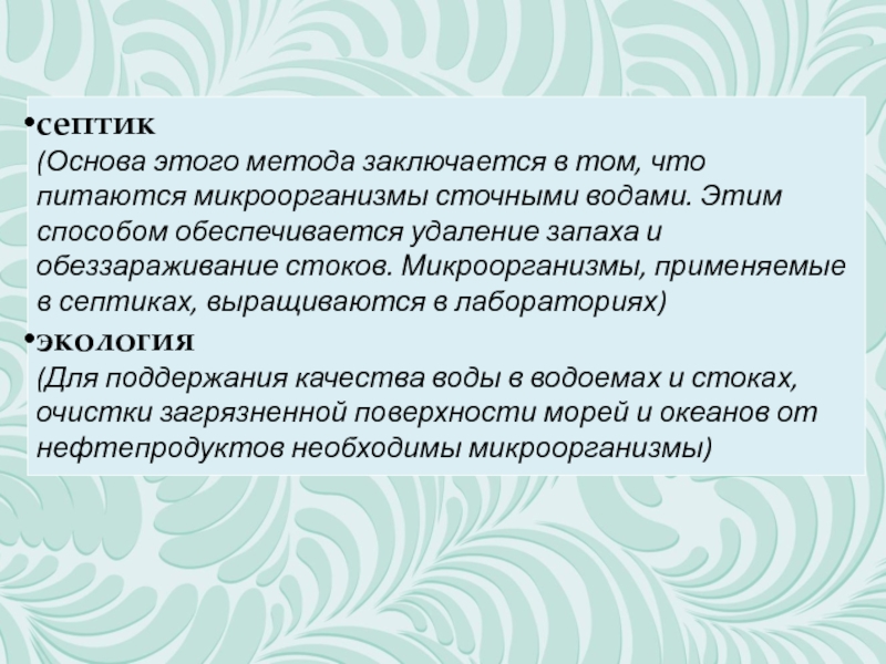 (Для поддержания качества воды в водоемах и стоках, очистки загрязненной поверхности морей и океанов от нефтепродуктов необходимы микроорганизмы)