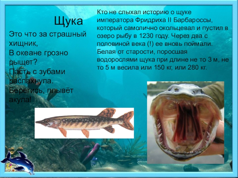 Кто не слыхал историю о щуке императора Фридриха II Барбароссы, который самолично окольцевал и пустил в озеро рыбу в 1230 году. Через два с половиной века (!) ее вновь поймали. Белая от старости, поросшая водорослями щука при длине не то 3 м, не то 5 м весила или 150 кг, или 280 кг.