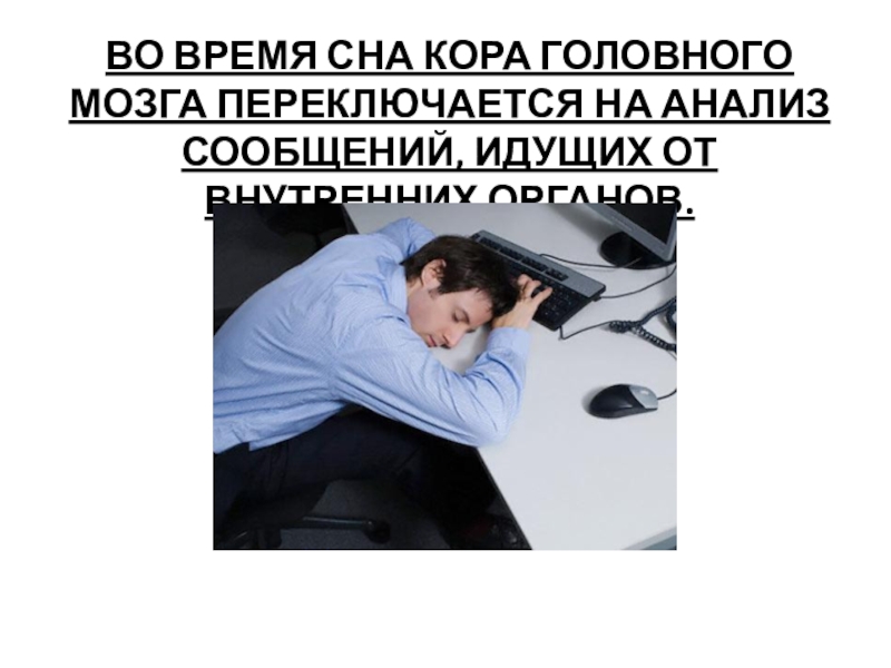 Слайд 30ВО ВРЕМЯ СНА КОРА ГОЛОВНОГО МОЗГА ПЕРЕКЛЮЧАЕТСЯ НА АНАЛИЗ СООБЩЕНИЙ, ИДУЩИХ