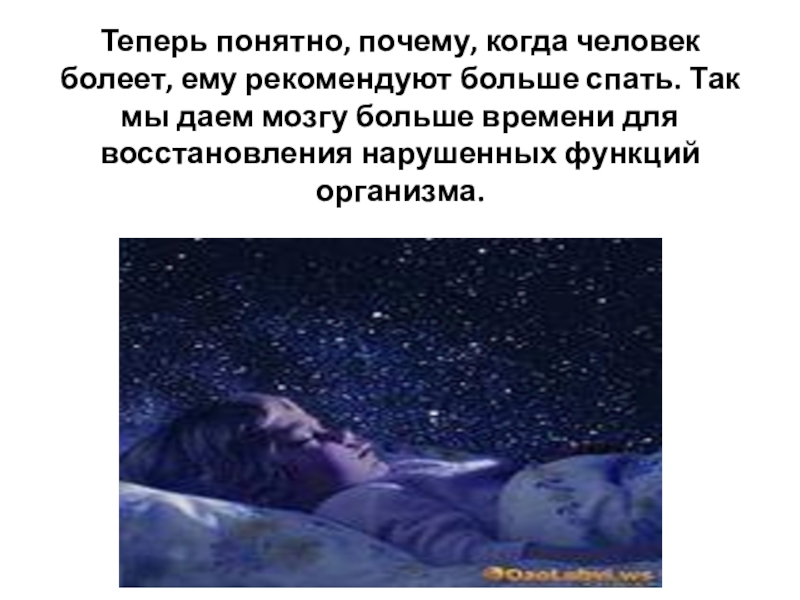 Слайд 33Теперь понятно, почему, когда человек болеет, ему рекомендуют больше спать. Так