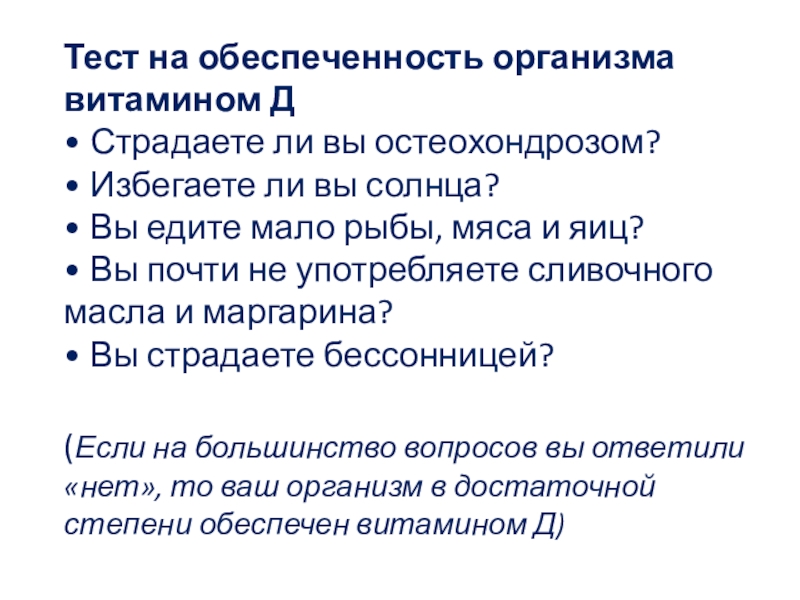 (Если на большинство вопросов вы ответили «нет», то ваш организм в достаточной степени обеспечен витамином Д)