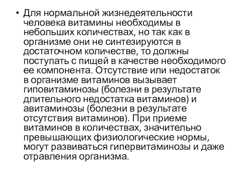 как в организме они не синтезируются в достаточном количестве, то должны поступать с пищей в качестве необходимого ее компонента. Отсутствие или недостаток в организме витаминов вызывает гиповитаминозы (болезни в результате длительного недостатка витаминов) и авитаминозы (болезни в результате отсутствия витаминов). При приеме витаминов в количествах, значительно превышающих физиологические нормы, могут развиваться гипервитаминозы и даже отравления организма.