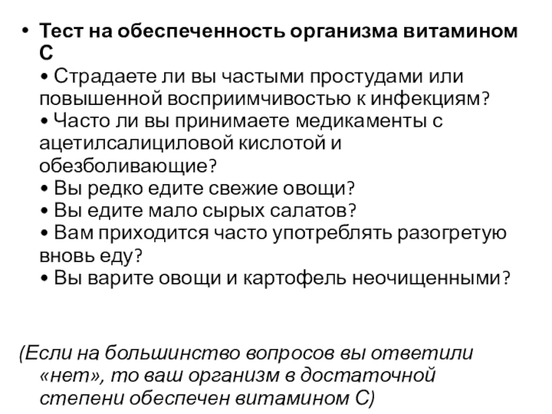 (Если на большинство вопросов вы ответили «нет», то ваш организм в достаточной степени обеспечен витамином С)