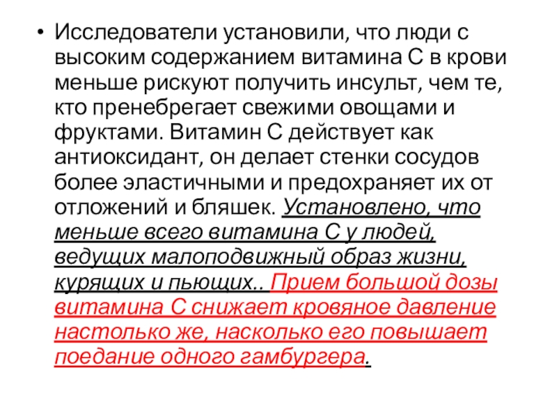 меньше рискуют получить инсульт, чем те, кто пренебрегает свежими овощами и фруктами. Витамин С действует как антиоксидант, он делает стенки сосудов более эластичными и предохраняет их от отложений и бляшек. Установлено, что меньше всего витамина С у людей, ведущих малоподвижный образ жизни, курящих и пьющих.. Прием большой дозы витамина С снижает кровяное давление настолько же, насколько его повышает поедание одного гамбургера.