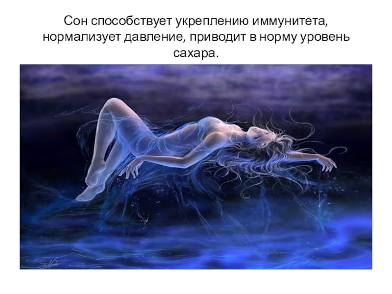 Слайд 36Сон способствует укреплению иммунитета, нормализует давление, приводит в норму уровень сахара.