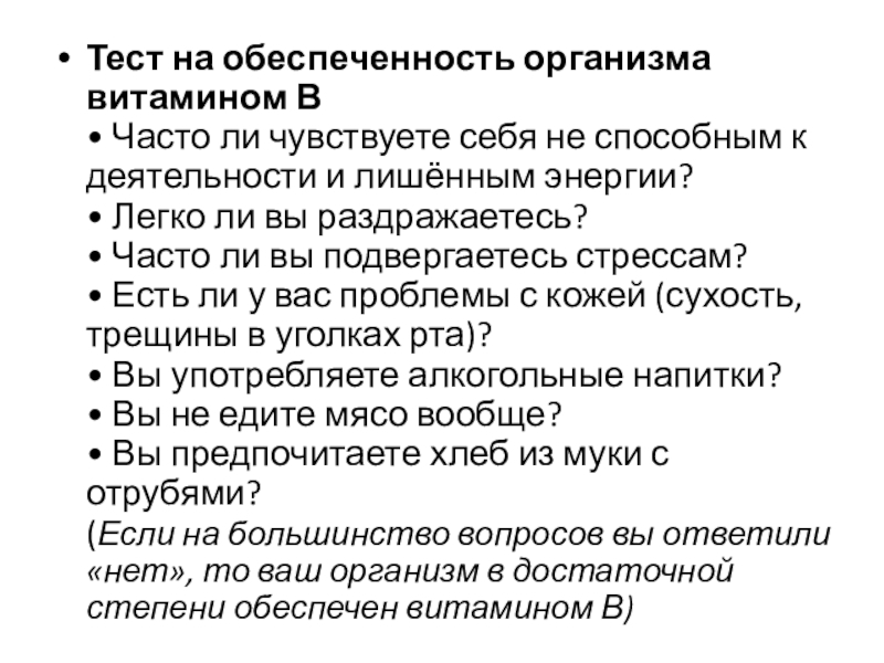 (Если на большинство вопросов вы ответили «нет», то ваш организм в достаточной степени обеспечен витамином В)