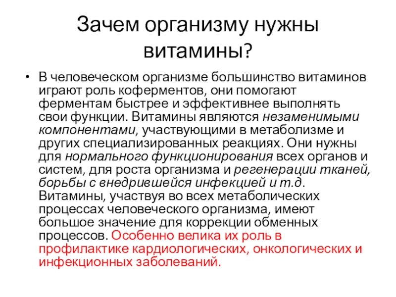 они помогают ферментам быстрее и эффективнее выполнять свои функции. Витамины являются незаменимыми компонентами, участвующими в метаболизме и других специализированных реакциях. Они нужны для нормального функционирования всех органов и систем, для роста организма и регенерации тканей, борьбы с внедрившейся инфекцией и т.д. Витамины, участвуя во всех метаболических процессах человеческого организма, имеют большое значение для коррекции обменных процессов. Особенно велика их роль в профилактике кардиологических, онкологических и инфекционных заболеваний.