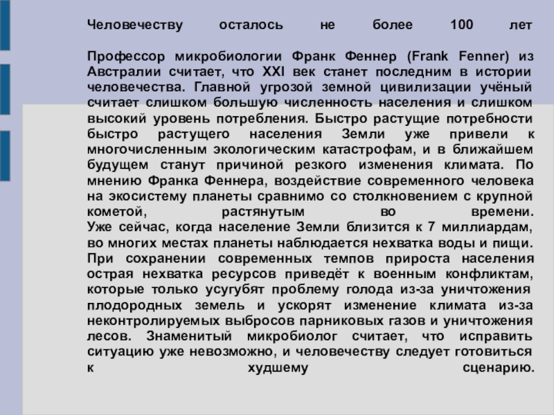 из Австралии считает, что XXI век станет последним в истории человечества. Главной угрозой земной цивилизации учёный считает слишком большую численность населения и слишком высокий уровень потребления. Быстро растущие потребности быстро растущего населения Земли уже привели к многочисленным экологическим катастрофам, и в ближайшем будущем станут причиной резкого изменения климата. По мнению Франка Феннера, воздействие современного человека на экосистему планеты сравнимо со столкновением с крупной кометой, растянутым во времени.