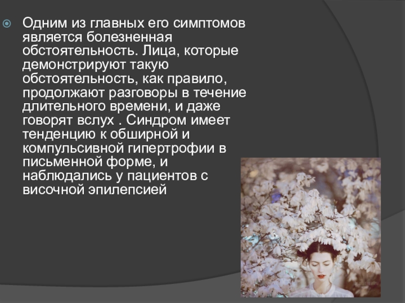 Слайд 4Одним из главных его симптомов является болезненная обстоятельность. Лица, которые демонстрируют