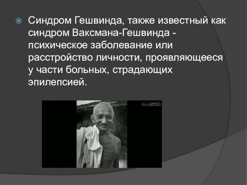 Слайд 2Синдром Гешвинда, также известный как синдром Ваксмана-Гешвинда - психическое заболевание или