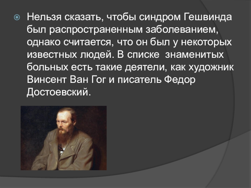 он был у некоторых известных людей. В списке знаменитых больных есть такие деятели, как художник Винсент Ван Гог и писатель Федор Достоевский.