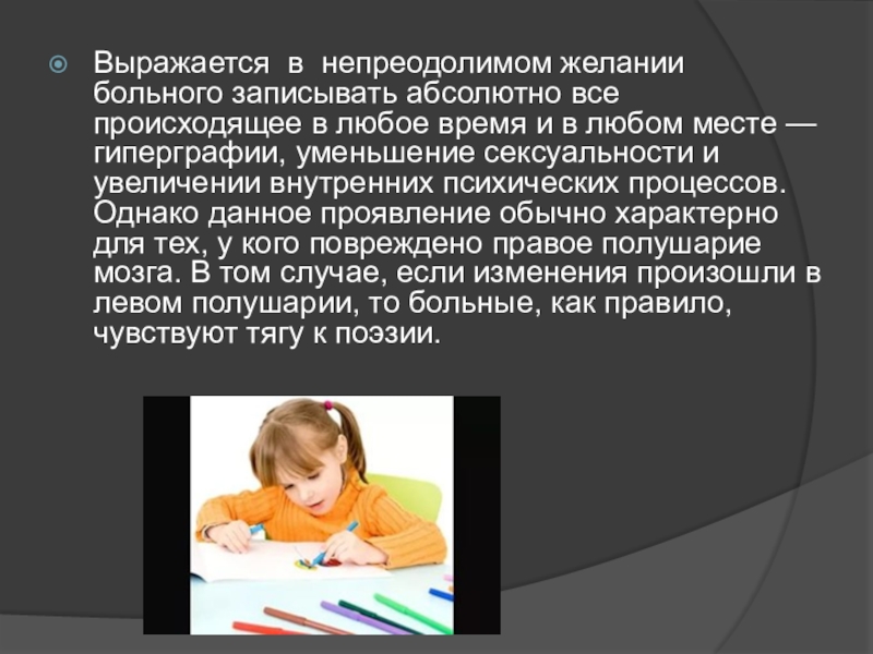 время и в любом месте — гиперграфии, уменьшение сексуальности и увеличении внутренних психических процессов. Однако данное проявление обычно характерно для тех, у кого повреждено правое полушарие мозга. В том случае, если изменения произошли в левом полушарии, то больные, как правило, чувствуют тягу к поэзии.