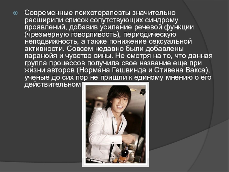 Слайд 6Современные психотерапевты значительно расширили список сопутствующих синдрому проявлений, добавив усиление речевой