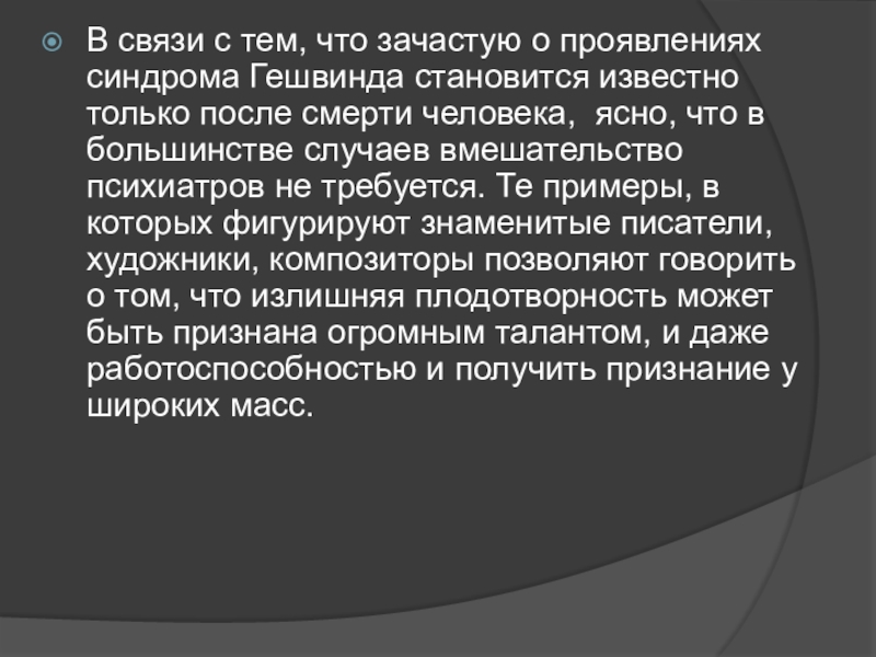 Слайд 7В связи с тем, что зачастую о проявлениях синдрома Гешвинда становится