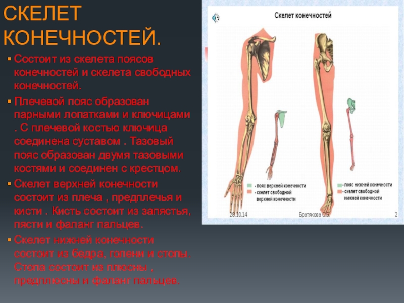 Состоит из скелета поясов конечностей и скелета свободных конечностей.