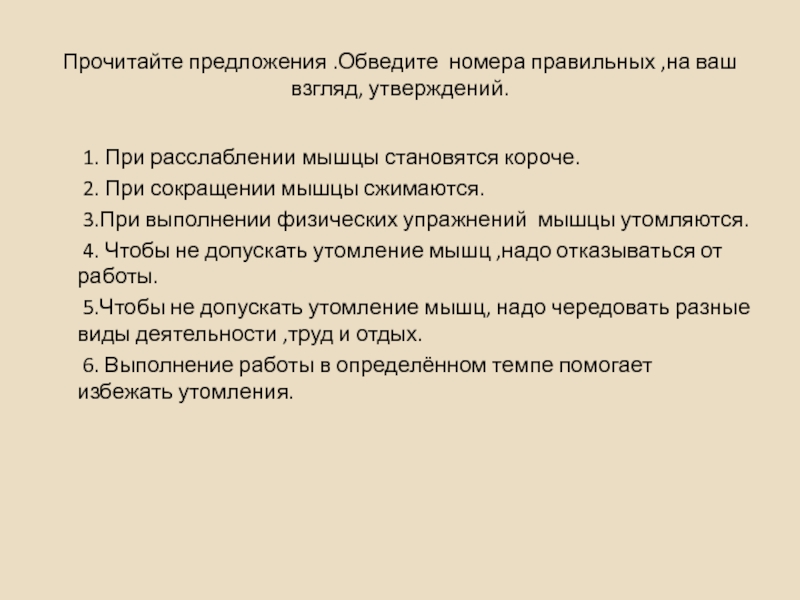 4. Чтобы не допускать утомление мышц ,надо отказываться от работы.