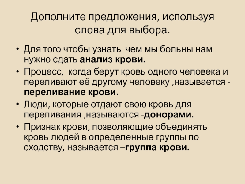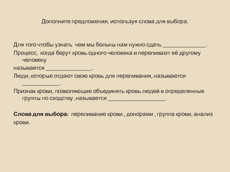 Слова для выбора: переливание крови , донорами , группа крови, анализ