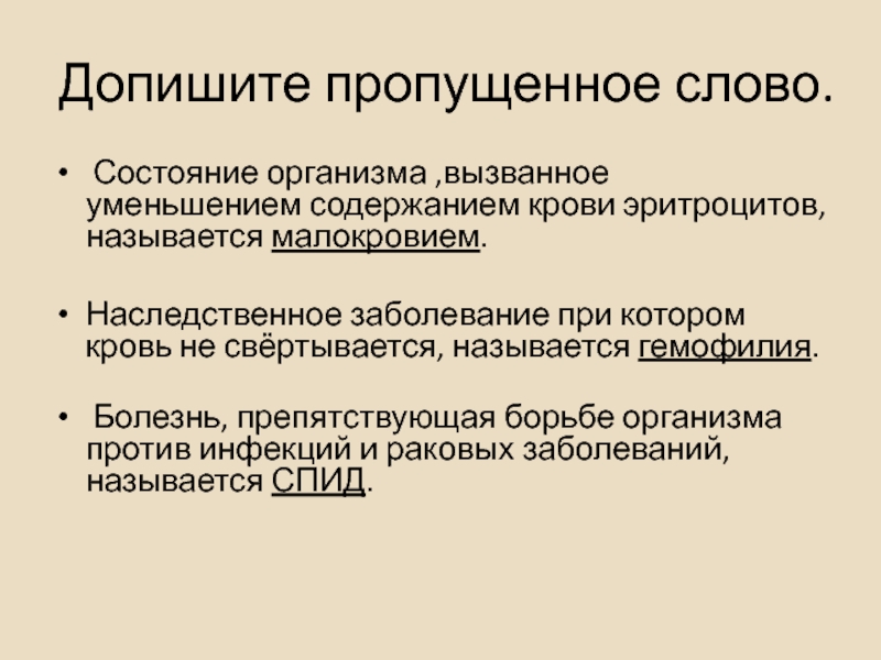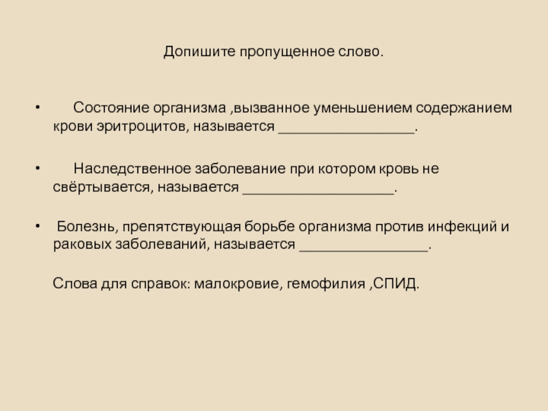 Слова для справок: малокровие, гемофилия ,СПИД.