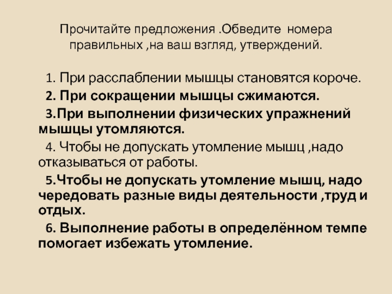 5.Чтобы не допускать утомление мышц, надо чередовать разные виды деятельности ,труд и отдых.
