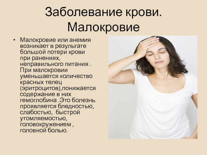 крови при ранениях, неправильного питания .При малокровии уменьшается количество красных телец(эритроцитов),понижается содержание в них гемоглобина .Это болезнь проявляется бледностью, слабостью, быстрой утомляемостью, головокружением ,головной болью.