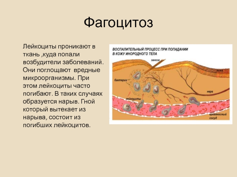 Они поглощают вредные микроорганизмы. При этом лейкоциты часто погибают. В таких случаях образуется нарыв. Гной который вытекает из нарыва, состоит из погибших лейкоцитов.