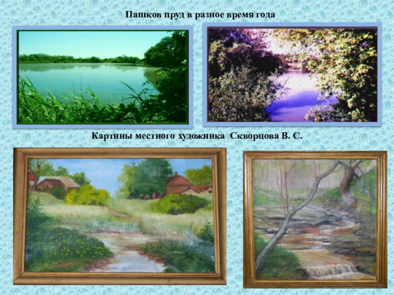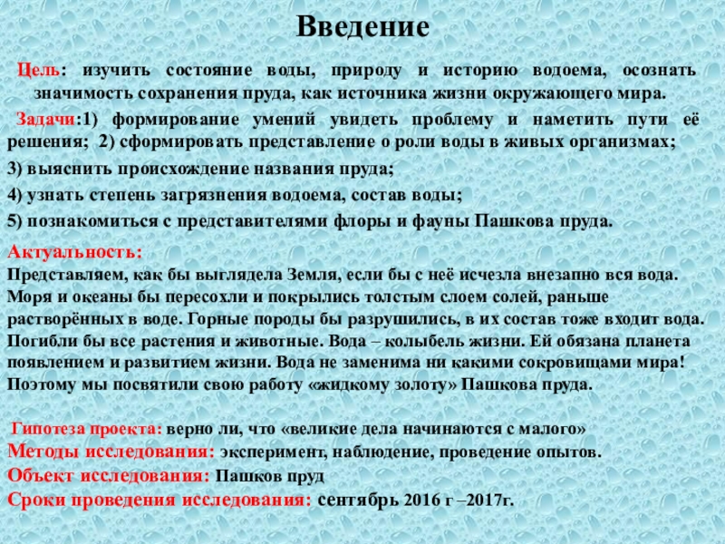 Представляем, как бы выглядела Земля, если бы с неё исчезла внезапно вся вода. Моря и океаны бы пересохли и покрылись толстым слоем солей, раньше растворённых в воде. Горные породы бы разрушились, в их состав тоже входит вода. Погибли бы все растения и животные. Вода – колыбель жизни. Ей обязана планета появлением и развитием жизни. Вода не заменима ни какими сокровищами мира! Поэтому мы посвятили свою работу «жидкому золоту» Пашкова пруда.