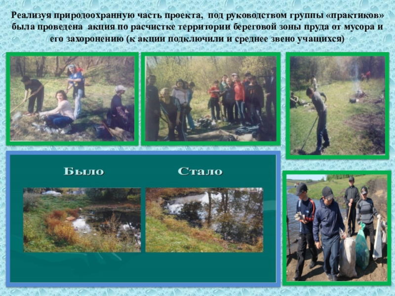 акции по расчистке территории береговой зоны пруда от мусора и его захоронению, завоз песка, размещение наглядной агитации ( Плуталов З- ученик 9кл. АлиеваЗ- ученица 7 кл.)