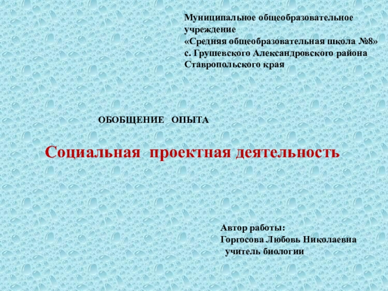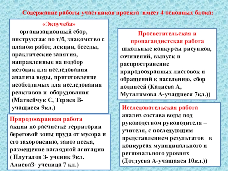 анализ состава воды под руководством руководителя – учителя, с последующим представлением результатов в конкурсах муниципального и регионального уровнях (Дотдуева А-учащаяся 10кл.))