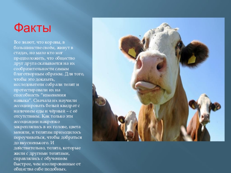 но мало кто мог предположить, что общество друг друга сказывается на их сообразительности самым благотворным образом. Для того, чтобы это доказать, исследователи собрали телят и протестировали их на способность “изменения навыка”. Сначала их научили ассоциировать белый квадрат с наличием еды и чёрный – с её отсутствием. Как только эти ассоциации накрепко закреплялись в их голове, цвета меняли, и телятам приходилось переучиваться, чтобы добраться до вкусненького. И действительно, телята, которые жили с другими телятами, справлялись с обучением быстрее, чем изолированные от общества себе подобных.