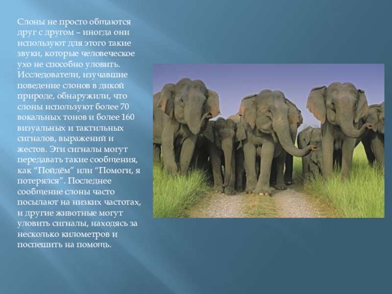 для этого такие звуки, которые человеческое ухо не способно уловить. Исследователи, изучавшие поведение слонов в дикой природе, обнаружили, что слоны используют более 70 вокальных тонов и более 160 визуальных и тактильных сигналов, выражений и жестов. Эти сигналы могут передавать такие сообщения, как “Пойдём” или “Помоги, я потерялся”. Последнее сообщение слоны часто посылают на низких частотах, и другие животные могут уловить сигналы, находясь за несколько километров и поспешить на помощь.