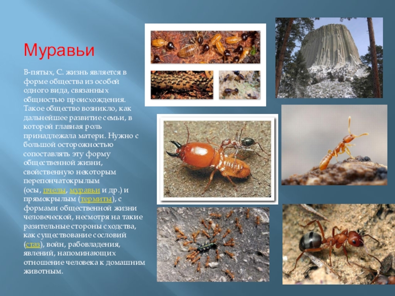 вида, связанных общностью происхождения. Такое общество возникло, как дальнейшее развитие семьи, в которой главная роль принадлежала матери. Нужно с большой осторожностью сопоставлять эту форму общественной жизни, свойственную некоторым перепончатокрылым (осы, пчелы, муравьи и др.) и прямокрылым (термиты), с формами общественной жизни человеческой, несмотря на такие разительные стороны сходства, как существование сословий (стаз), войн, рабовладения, явлений, напоминающих отношение человека к домашним животным.