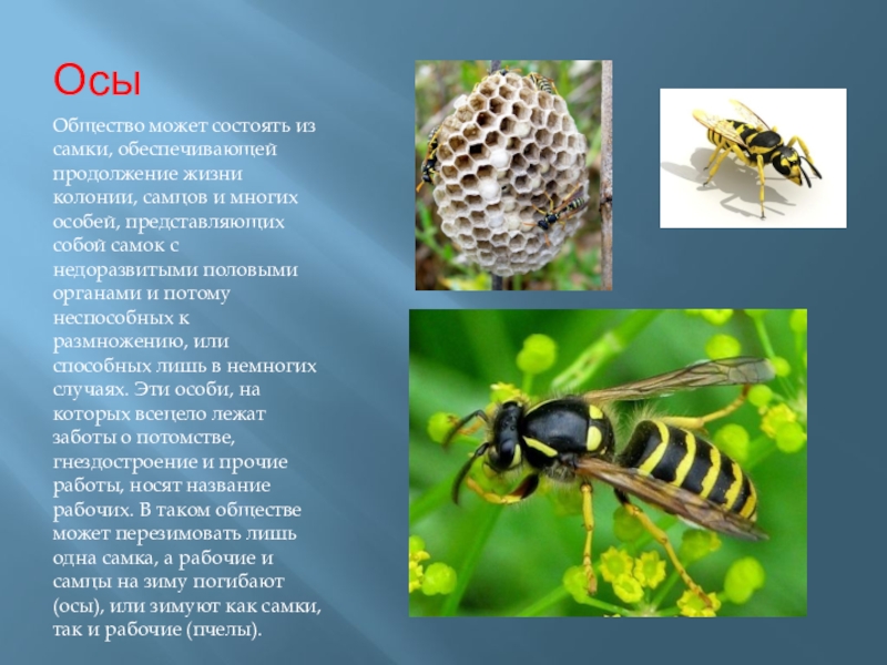 и многих особей, представляющих собой самок с недоразвитыми половыми органами и потому неспособных к размножению, или способных лишь в немногих случаях. Эти особи, на которых всецело лежат заботы о потомстве, гнездостроение и прочие работы, носят название рабочих. В таком обществе может перезимовать лишь одна самка, а рабочие и самцы на зиму погибают (осы), или зимуют как самки, так и рабочие (пчелы).