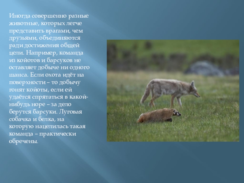 ради достижения общей цели. Например, команда из койотов и барсуков не оставляет добыче ни одного шанса. Если охота идёт на поверхности – то добычу гонят койоты, если ей удаётся спрятаться в какой-нибудь норе – за дело берутся барсуки. Луговая собачка и белка, на которую нацелилась такая команда – практически обречены.