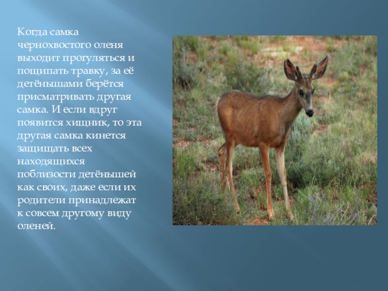 Слайд 10Когда самка чернохвостого оленя выходит прогуляться и пощипать травку, за её