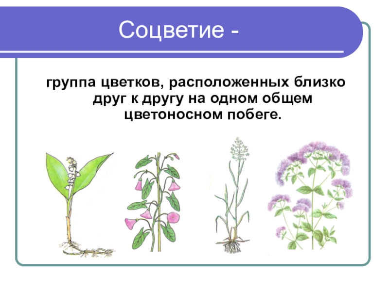 Соцветие -группа цветков, расположенных близко друг к другу на одном общем цветоносном побеге.