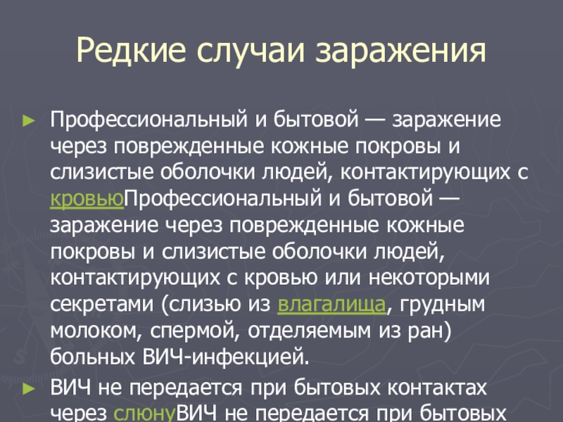 слизистые оболочки людей, контактирующих с кровьюПрофессиональный и бытовой — заражение через поврежденные кожные покровы и слизистые оболочки людей, контактирующих с кровью или некоторыми секретами (слизью из влагалища, грудным молоком, спермой, отделяемым из ран) больных ВИЧ-инфекцией.