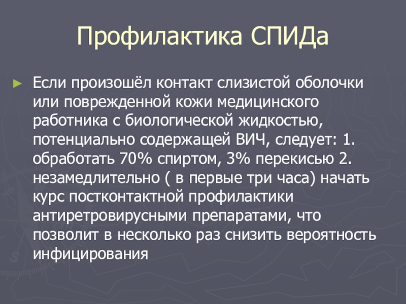 с биологической жидкостью, потенциально содержащей ВИЧ, следует: 1.обработать 70% спиртом, 3% перекисью 2.незамедлительно ( в первые три часа) начать курс постконтактной профилактики антиретровирусными препаратами, что позволит в несколько раз снизить вероятность инфицирования