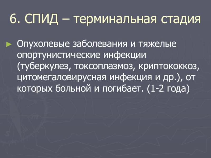 (туберкулез, токсоплазмоз, криптококкоз, цитомегаловирусная инфекция и др.), от которых больной и погибает. (1-2 года)