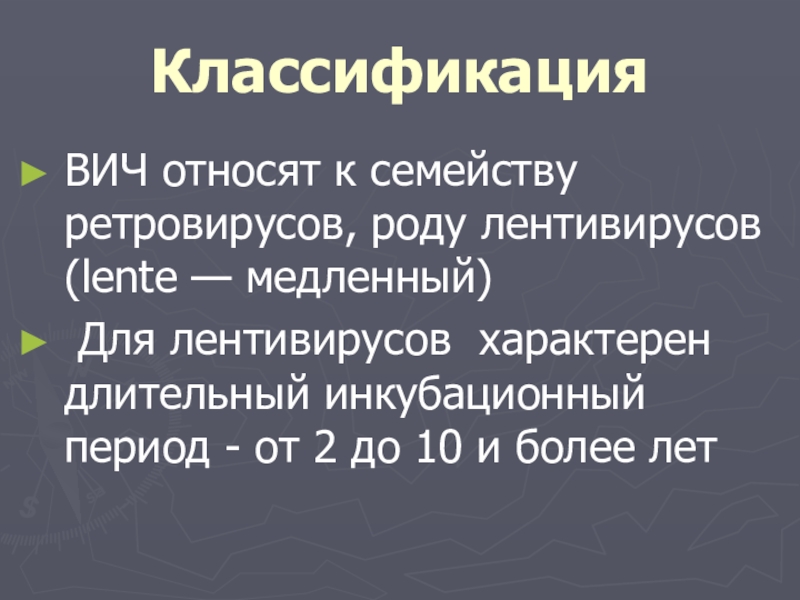 ВИЧ относят к семейству ретровирусов, роду лентивирусов (lente — медленный)