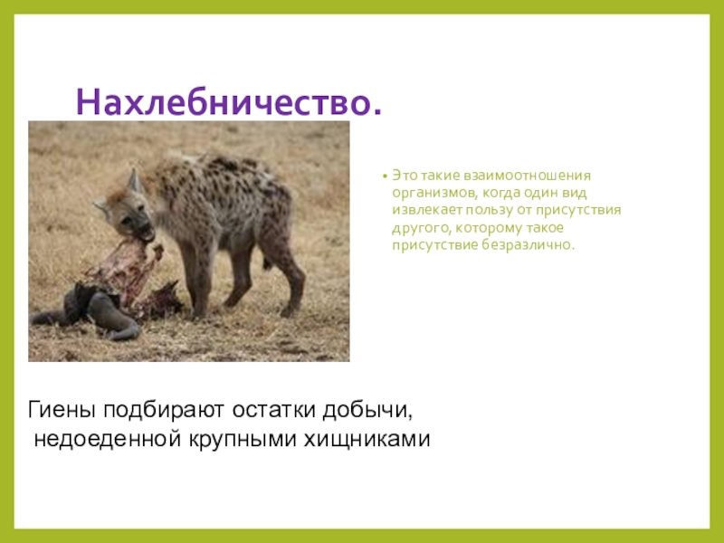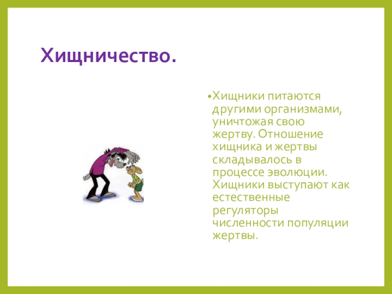 Хищники питаются другими организмами, уничтожая свою жертву. Отношение хищника и жертвы