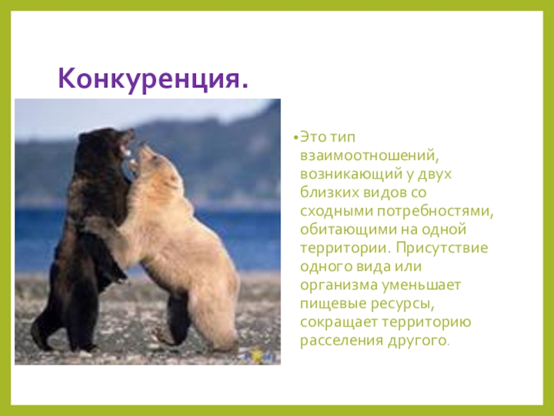 обитающими на одной территории. Присутствие одного вида или организма уменьшает пищевые ресурсы, сокращает территорию расселения другого.