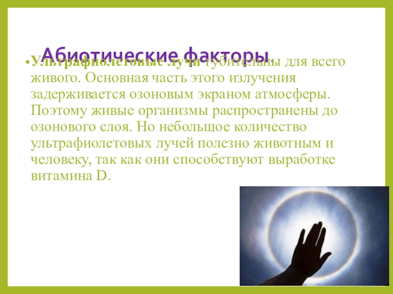 озоновым экраном атмосферы. Поэтому живые организмы распространены до озонового слоя. Но небольшое количество ультрафиолетовых лучей полезно животным и человеку, так как они способствуют выработке витамина D.