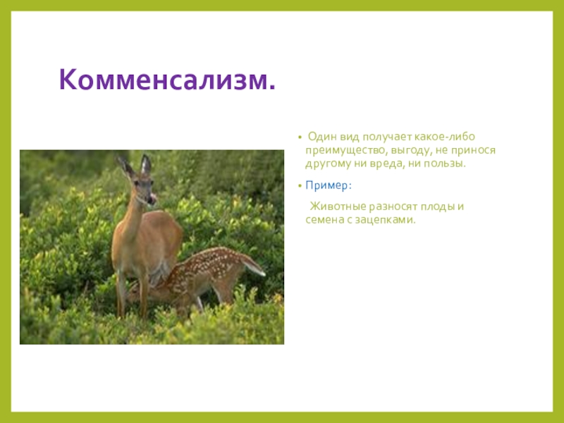 разными видами. При этом организмы не влияют друг на друга, непосредственно не связаны, хотя и имеют общие потребности в пище, так как занимают различные экологические ниши и не вступают во взаимоотношения друг с другом.