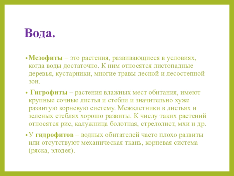 Мезофиты – это растения, развивающиеся в условиях, когда воды достаточно. К ним